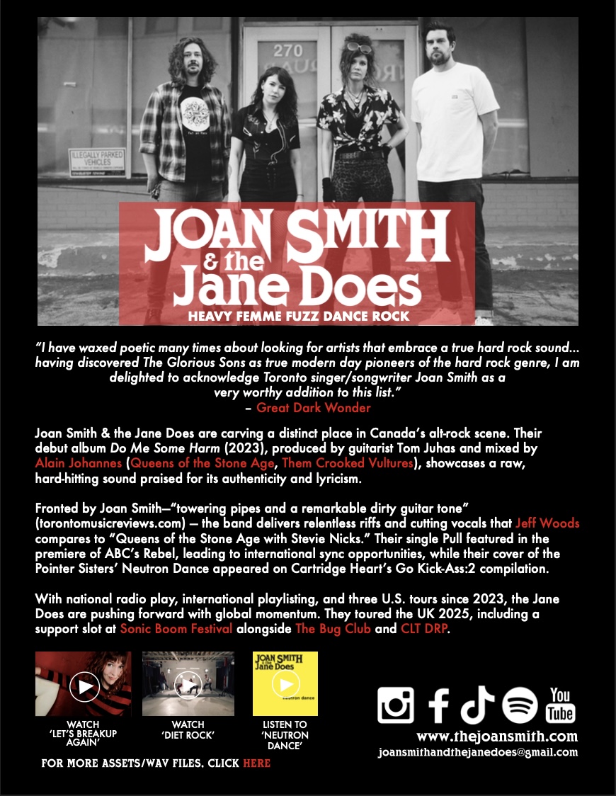 Joan Smith & the Jane Does are carving a distinct place in Canada’s alt-rock scene. Their debut album Do Me Some Harm (2023), produced by guitarist Tom Juhas and mixed by Alain Johannes (Queens of the Stone Age, Them Crooked Vultures), showcases a raw, hard-hitting sound praised for its authenticity and lyricism.